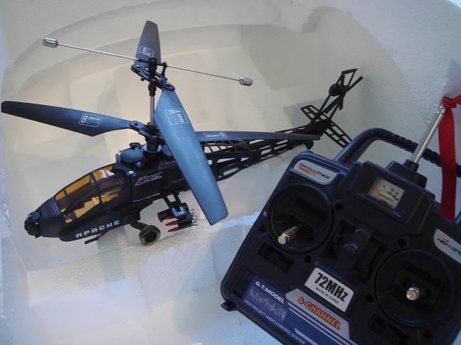 Great Buzzard 4- Channel Appache with Lipo battery Coaxial contra-rotating main rotor Using the Ultra tough iron-fiber materials New servo and mixer system Powerful lithium battery Micro servos, receiver, Gyro and Speed controller/mixer Description: R/C Electric Powered Helicopter 4channel STABLE &EASY FLYING DOUBLE MAIN ROTOR Packing Size: 49*42*63.5 CM Certificate: CE/ROHS
