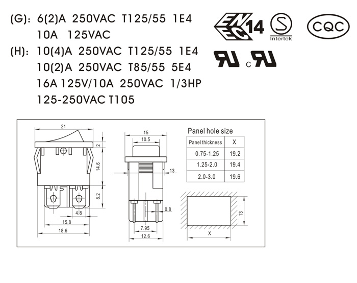 (G): 6(2)A 250VAC T125/55 1E4