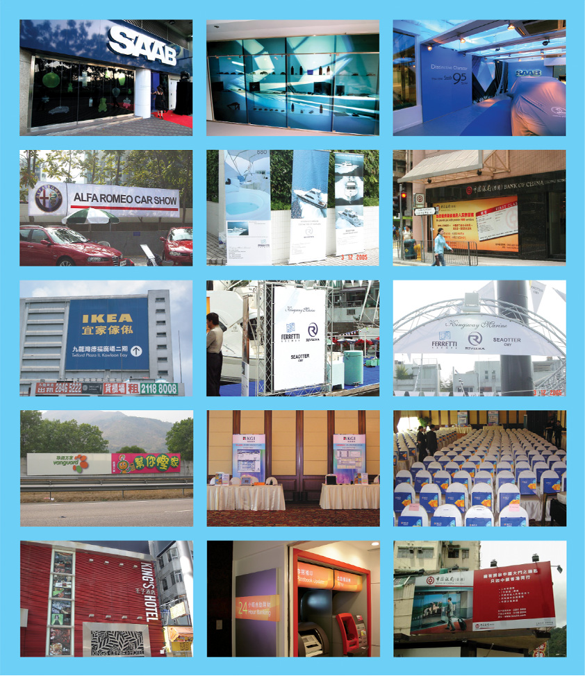 電腦彩色數碼輸出, 戶外及戶內廣告媒體展示 ,各類型展覽、 招牌安裝工, (有多種不同素材,免過膠防水紙光面相紙和戶內外廣告燈箱片等)