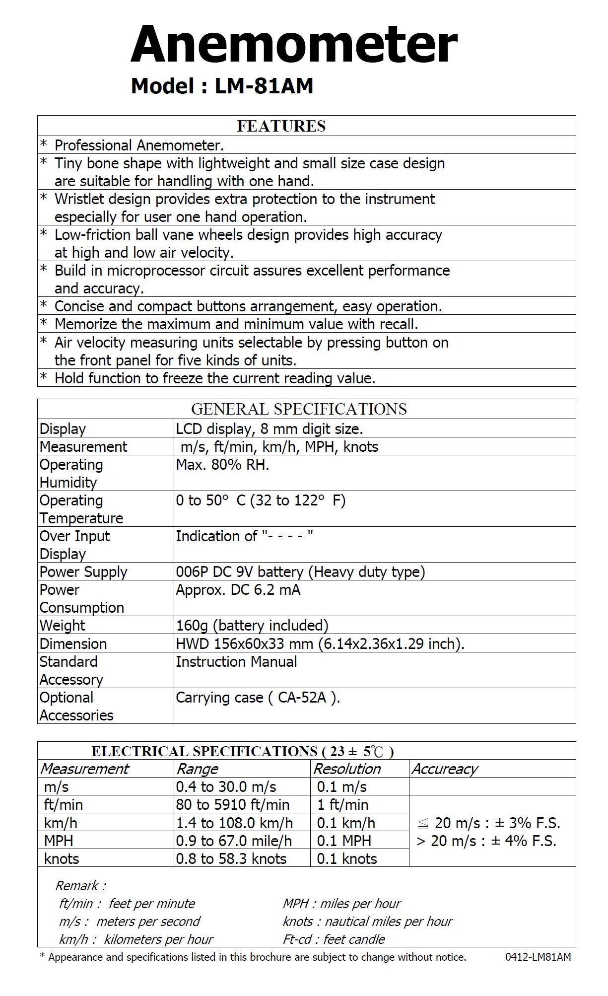 * Measuring range : 0.4 to 30.0 m/s.