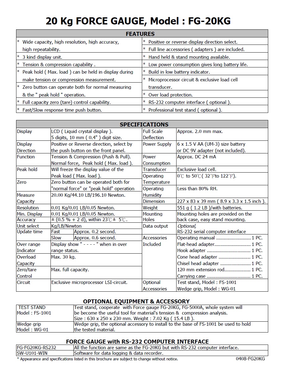 Product Name : | 20 Kg FORCE GAUGE - FG-20KG 推拉力計 |