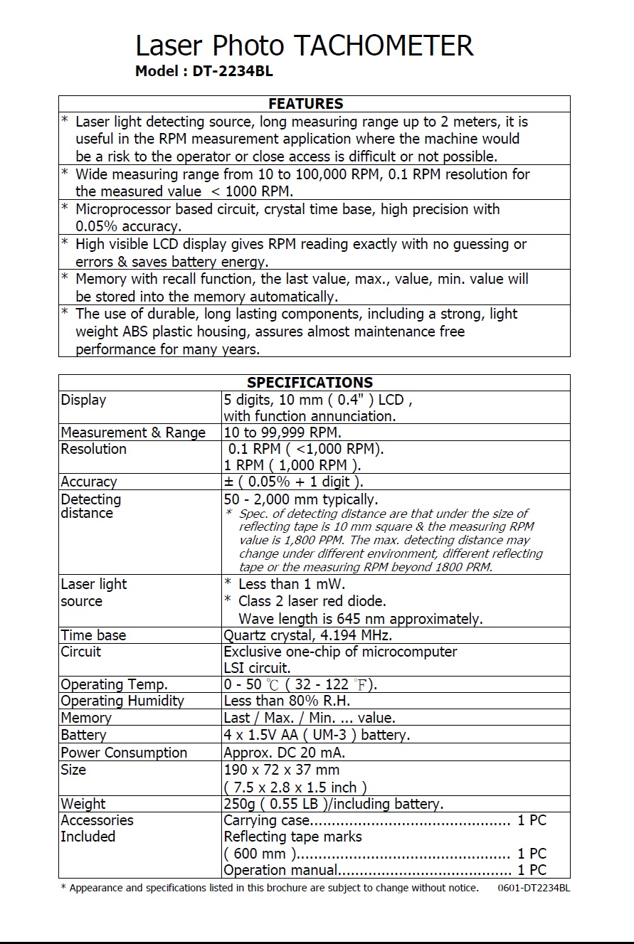 Product Name : | PHOTO TACHOMETER - DT-2234B 光電式轉速計 |