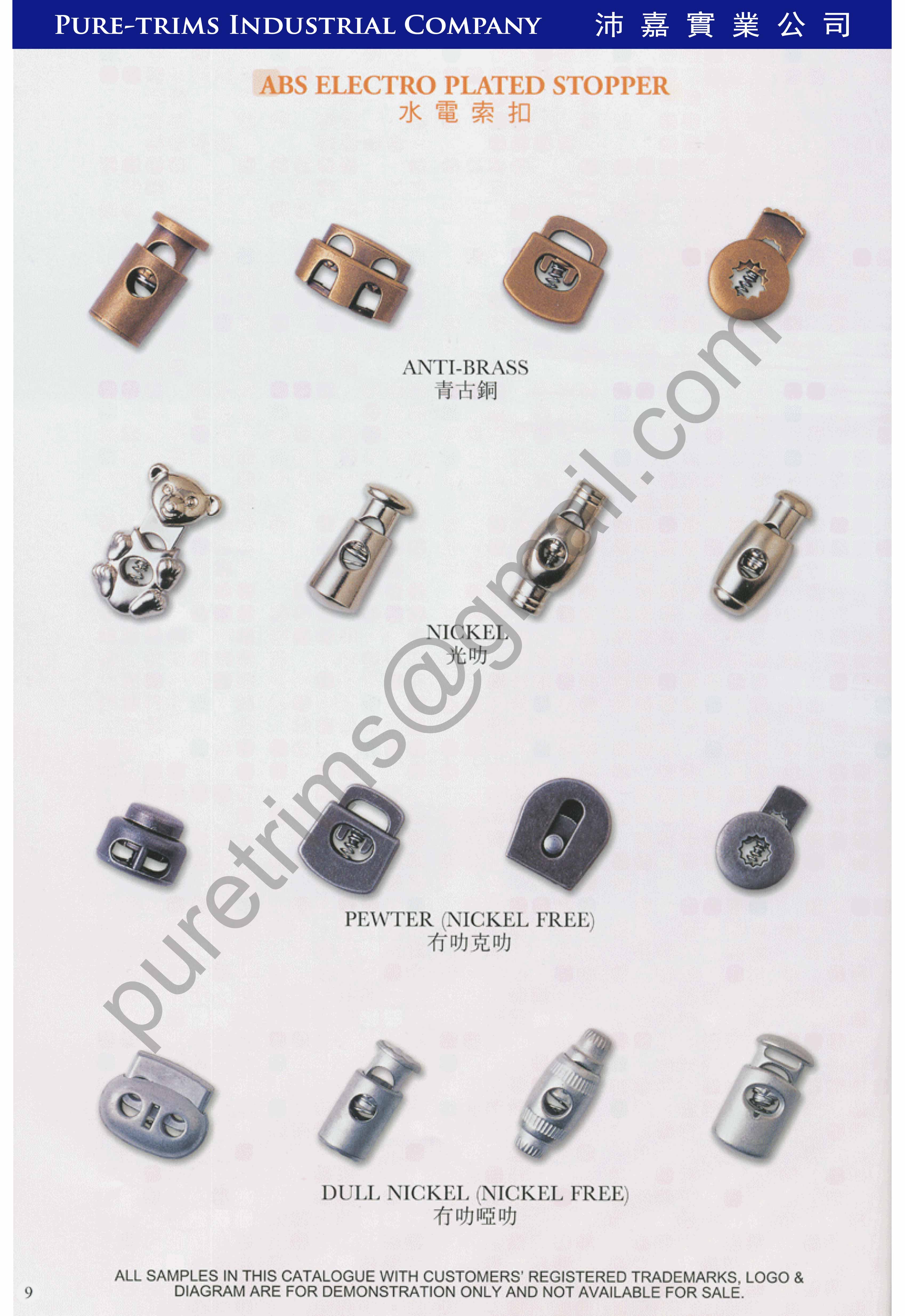 It is specialized in the production of buttons, stoppers, cordends, plastic buckles, end clips and zipper pullers, including but not limited to spray-painting, electroplating and screen-printing.