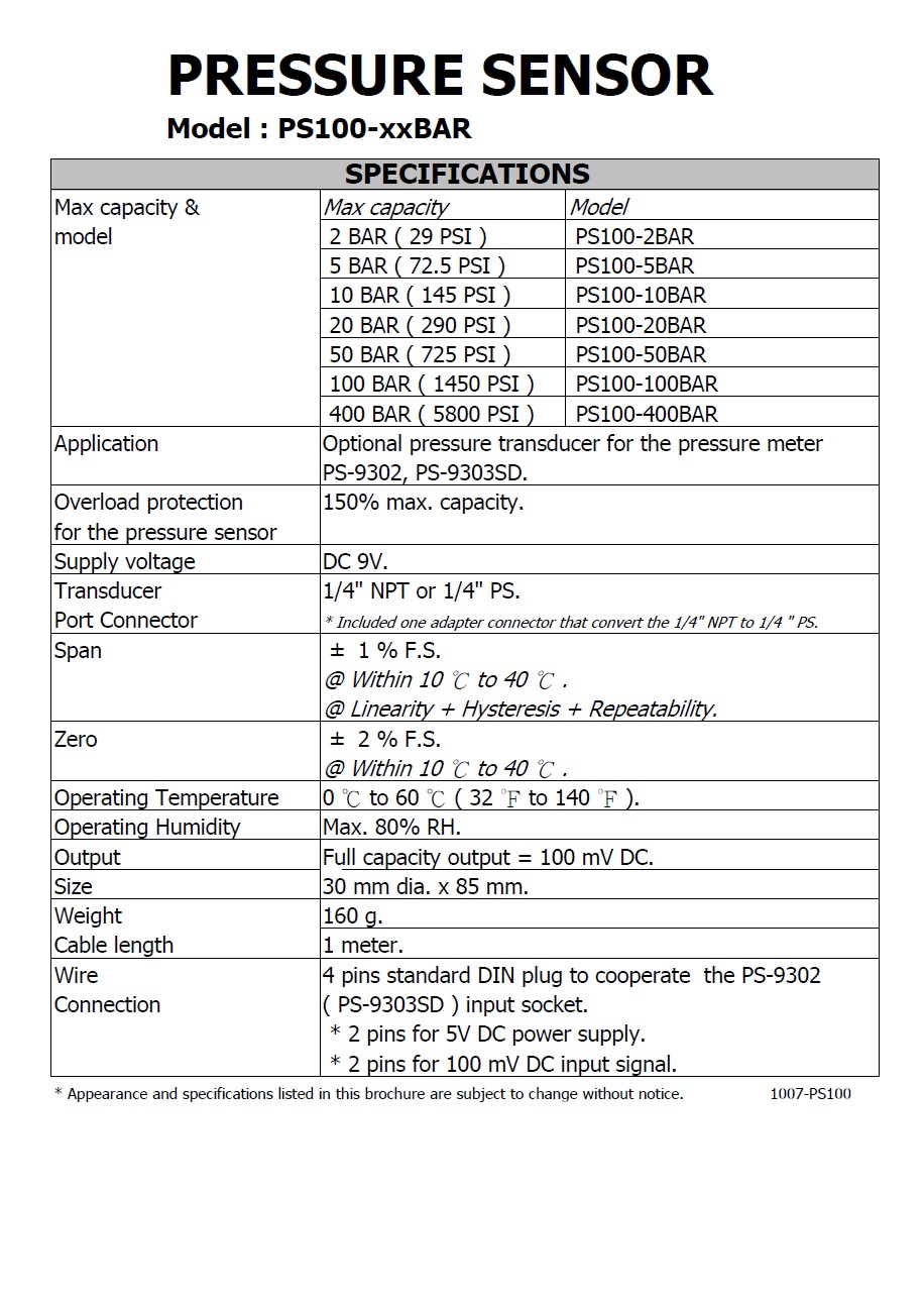 * PS100-100BAR : 100 bar sensor.