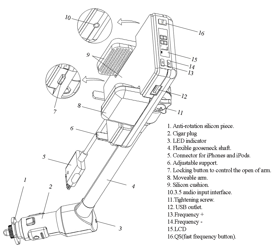 2. It's not only a hands-free car kit for iPhones, also is a high quality FM transmitter for enjoying Hi-Fi music in iPhones, iPods and MP3 through auto's stereo system.